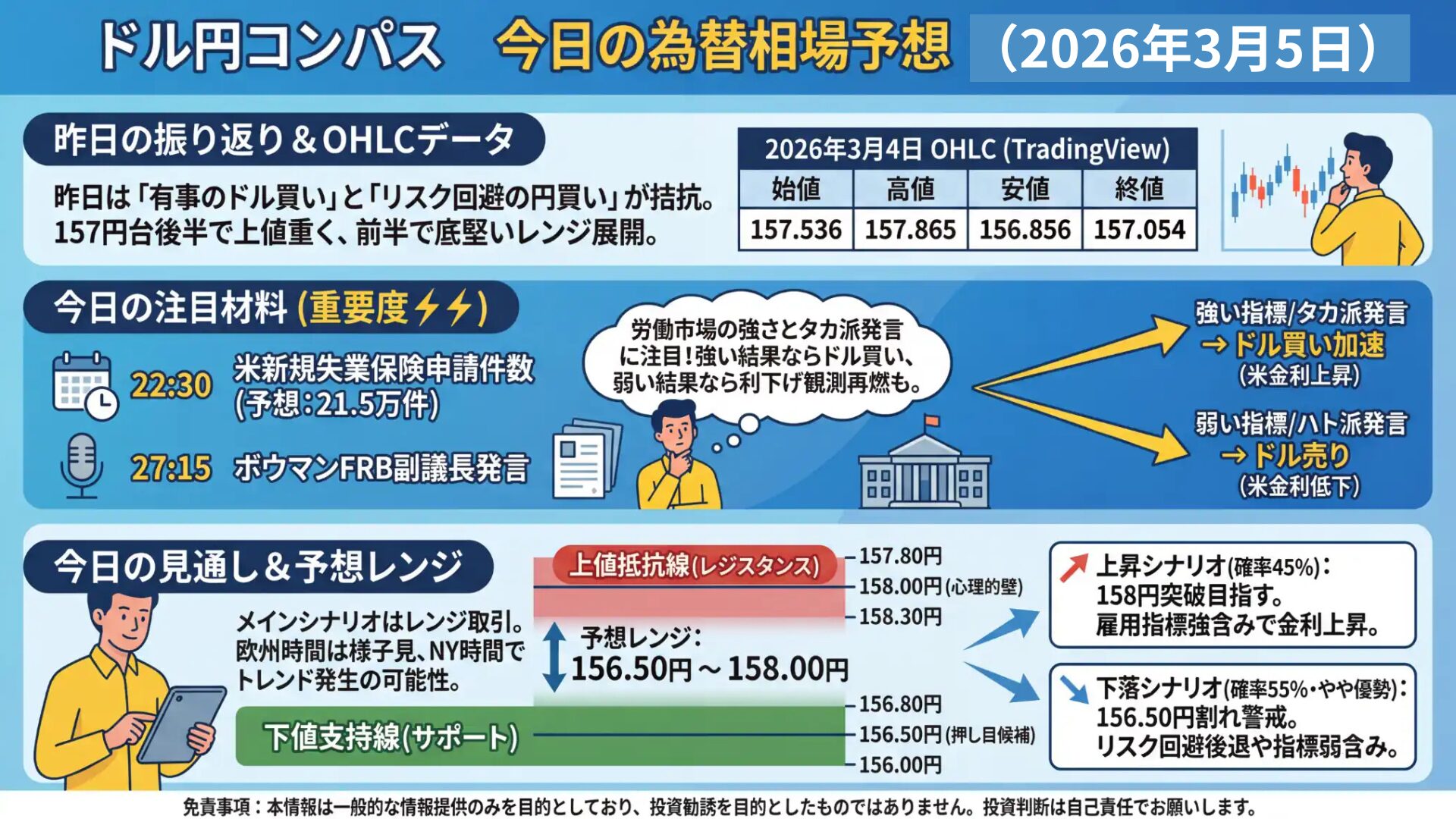 昨日の振り返り 昨日のドル円は、155円台後半から一気に157円台後半まで駆け上がった前日の流れを引き継ぎ、朝から終日157円台での推移となりました。東京時間は中東情勢の悪化懸念を背景に「有事のドル買い」が優勢となり、仲値にかけて157円後半に迫る場面も。その後は、株安によるリスク回避の円買いや、158円手前での介入警戒感が意識されつつも、欧州・NY時間を通じて高止まりが続き、157円台半ば〜後半で値動きが落ち着く一日となりました。 結果として、始値157.409円、高値157.972円、安値157.15 ...
