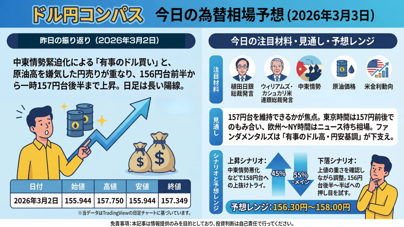 昨日の振り返り 昨日のドル円は、東京早朝にかけて155円台後半まで売りが先行したものの、その後はイラン情勢の緊迫化を受けた「有事のドル買い」が強まり、156円台を回復。日中は日経平均の大幅安や原油高などをにらみつつも、156円台前半〜後半で底堅く推移しました。欧州時間に入ると中東情勢の先行き不透明感から再びドル買い・円売りが優勢となり、NY時間には157円台半ばまで水準を切り上げています。 結果として、始値155.944円、高値157.750円、安値155.944円、終値157.349円と、 ...