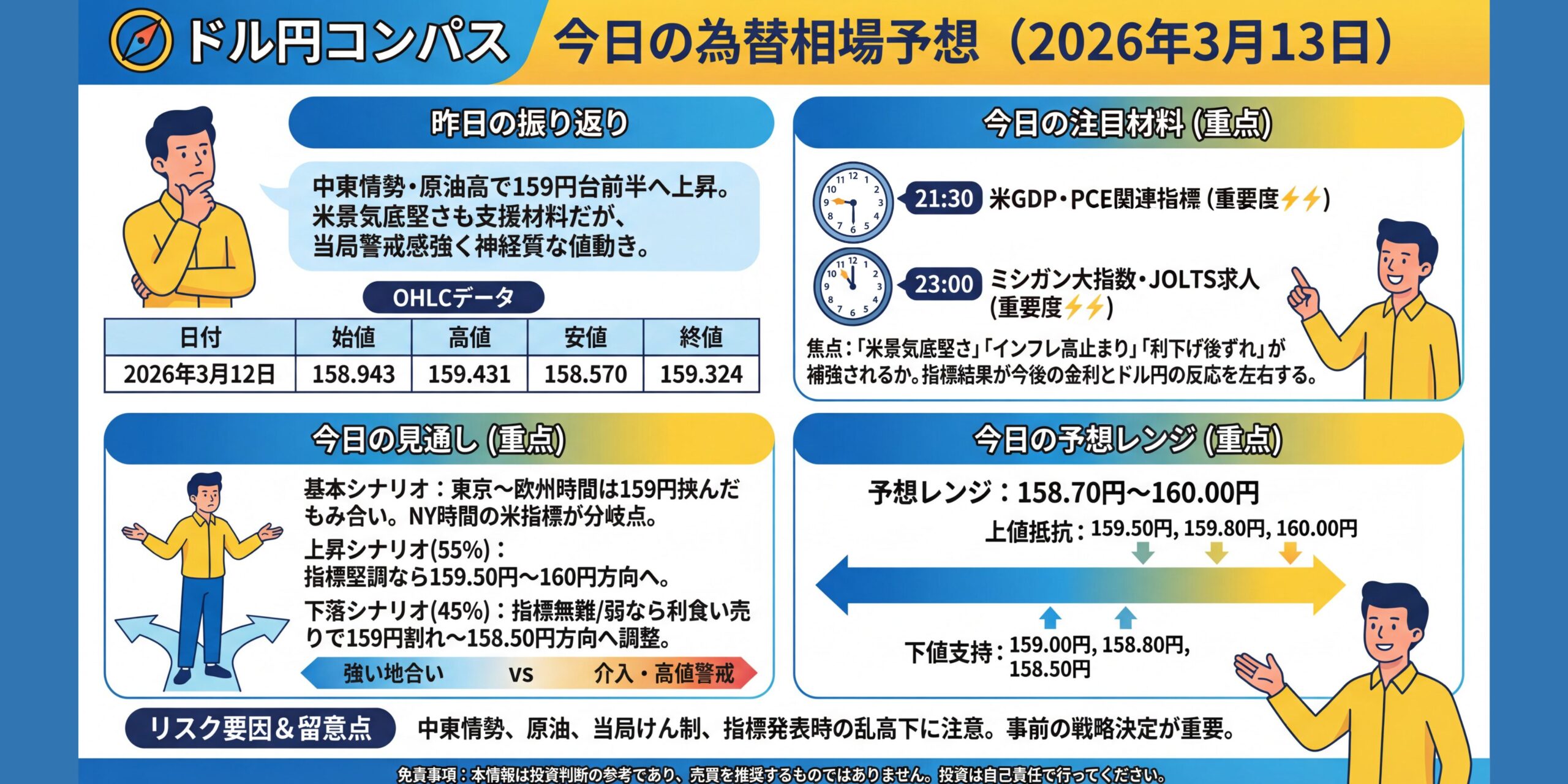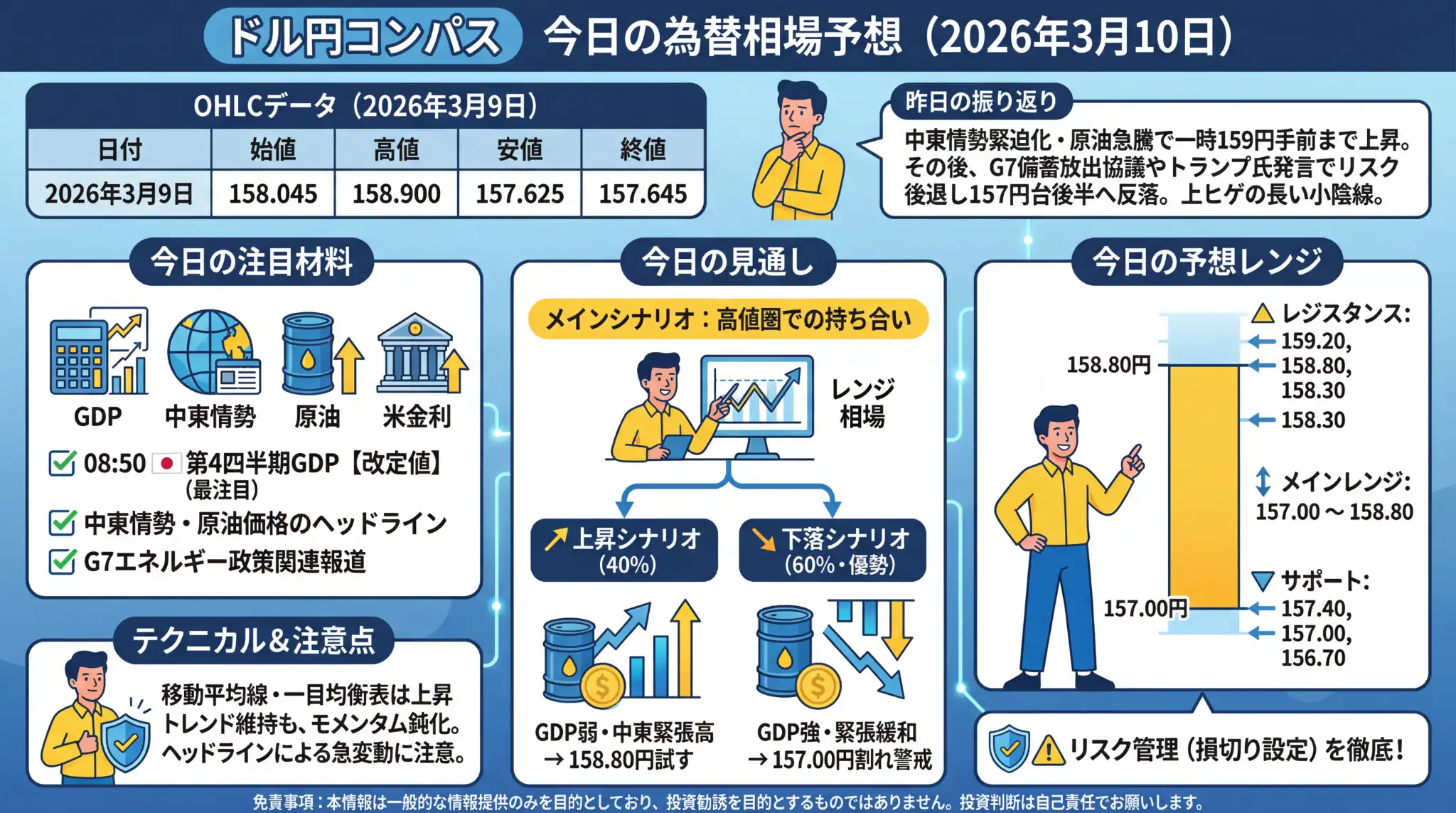 昨日の振り返り 昨日のドル円は、155円台後半から一気に157円台後半まで駆け上がった前日の流れを引き継ぎ、朝から終日157円台での推移となりました。東京時間は中東情勢の悪化懸念を背景に「有事のドル買い」が優勢となり、仲値にかけて157円後半に迫る場面も。その後は、株安によるリスク回避の円買いや、158円手前での介入警戒感が意識されつつも、欧州・NY時間を通じて高止まりが続き、157円台半ば〜後半で値動きが落ち着く一日となりました。 結果として、始値157.409円、高値157.972円、安値157.15 ...