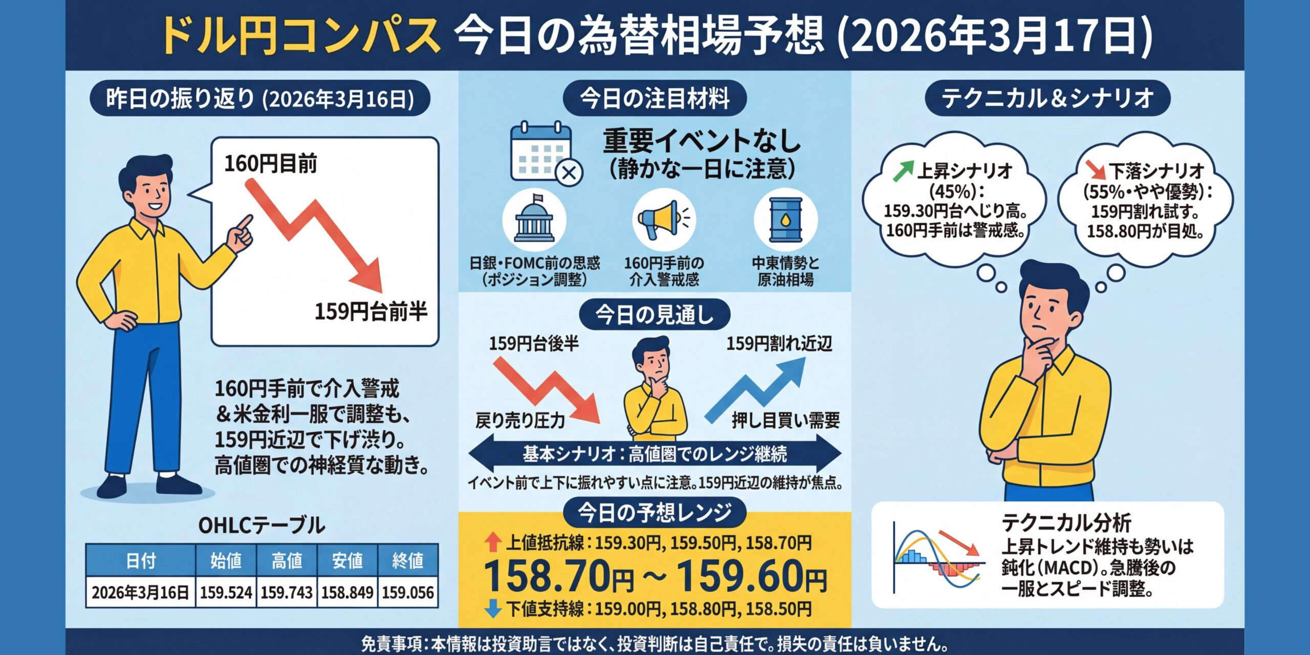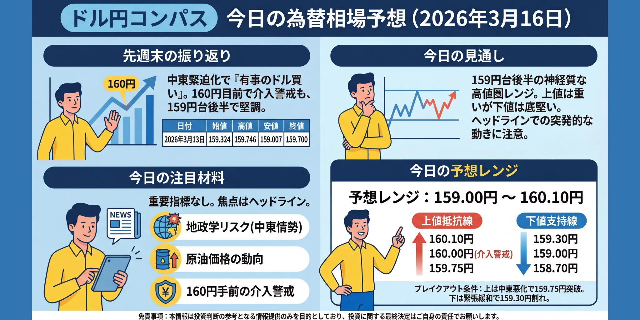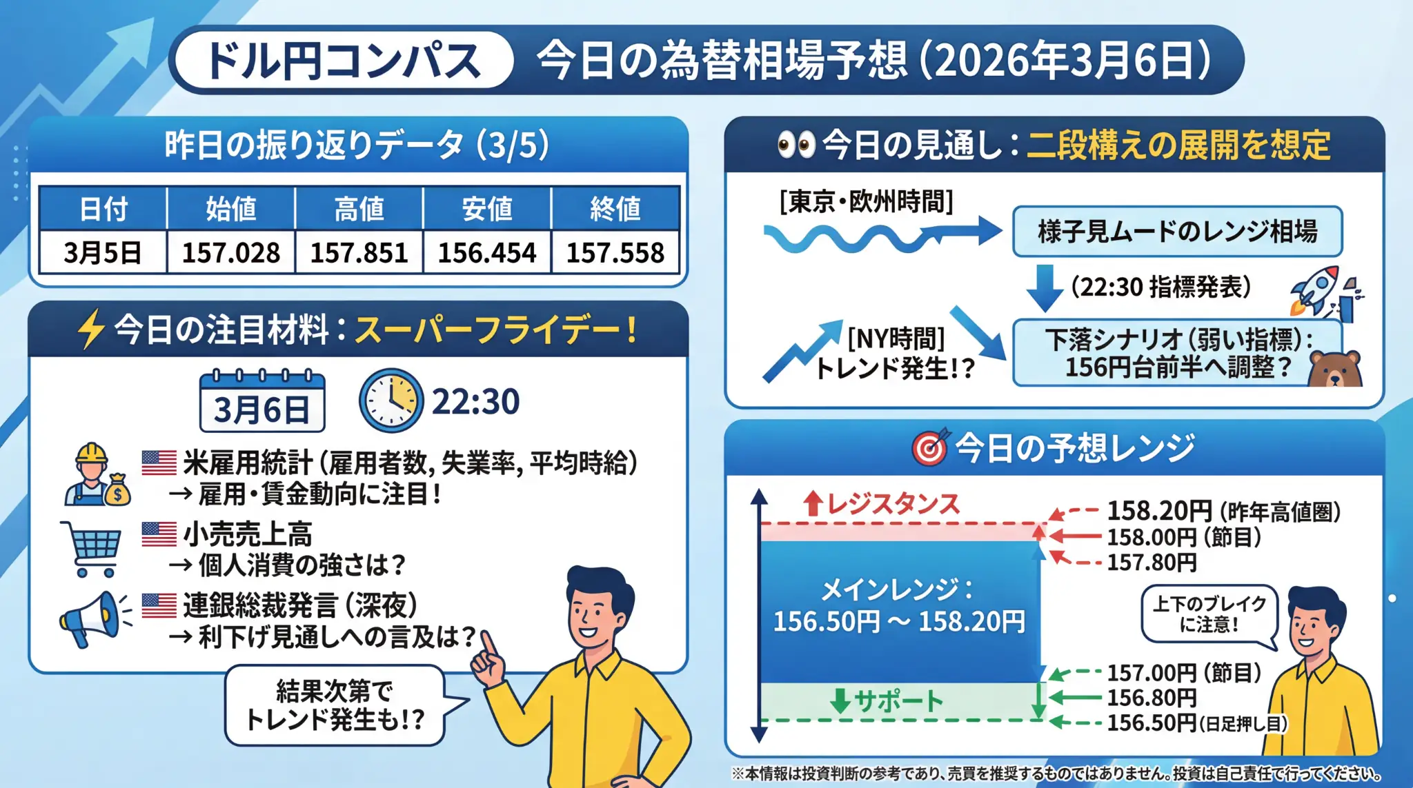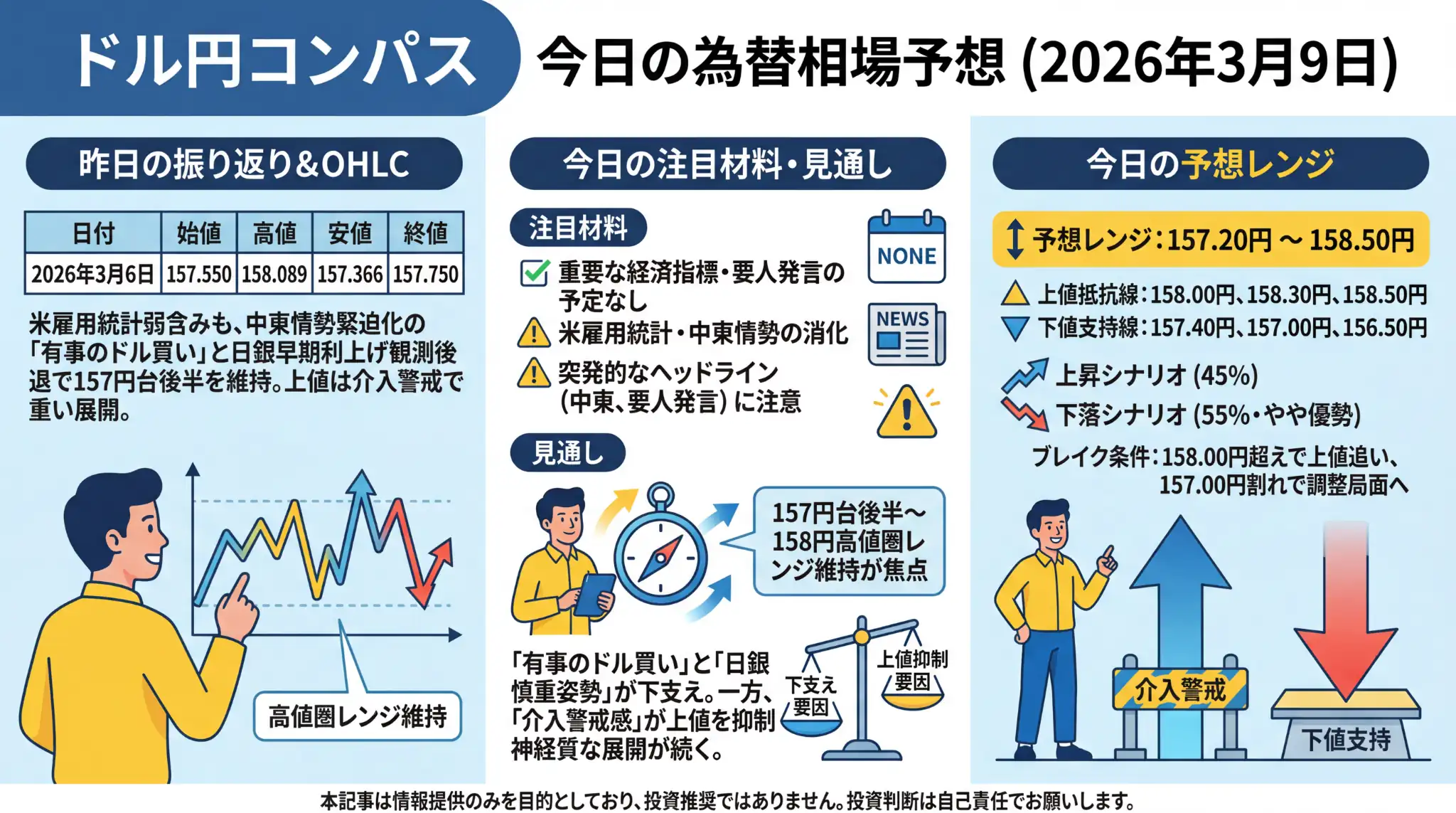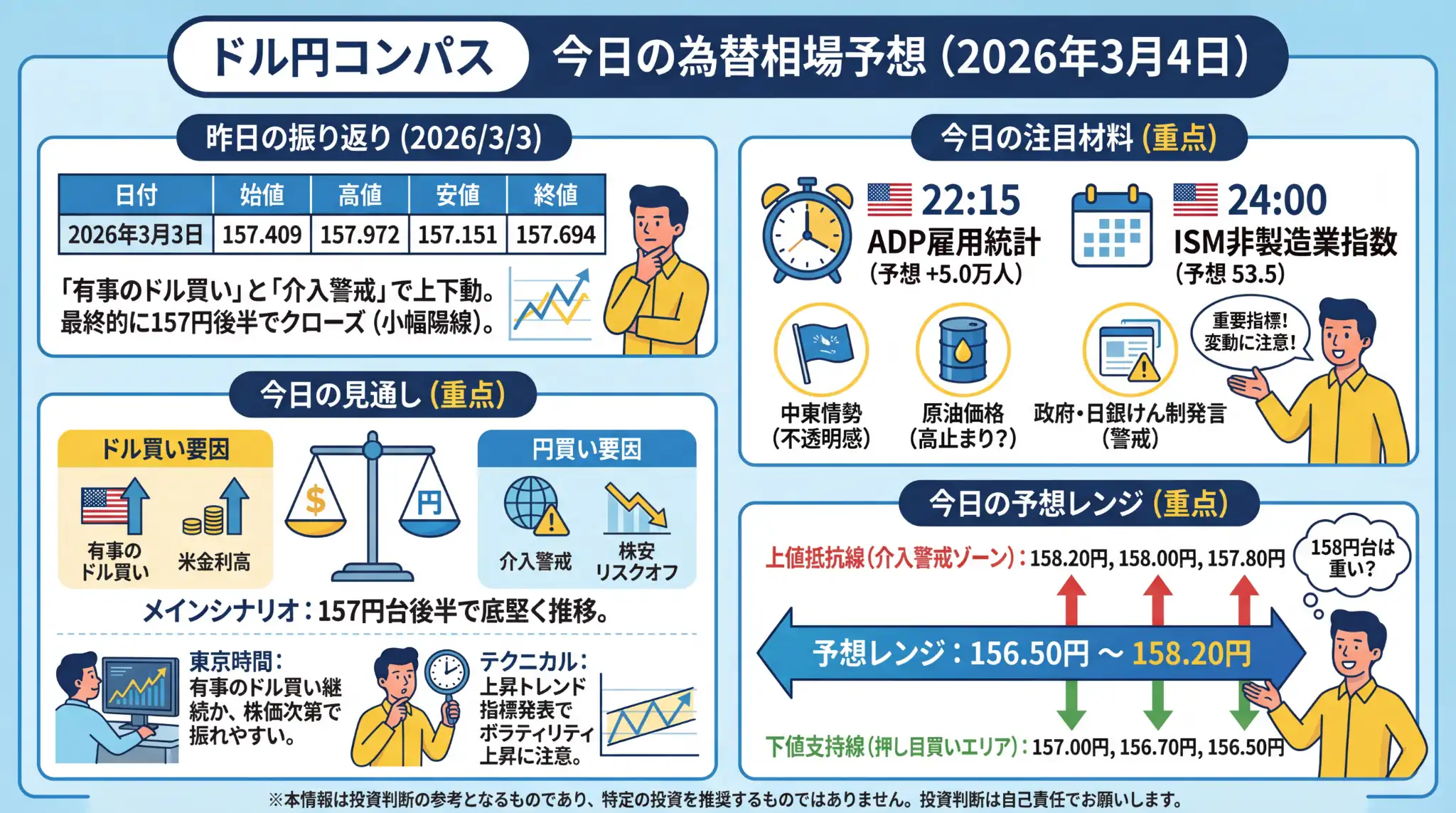 昨日の振り返り 昨日のドル円は、155円台後半から一気に157円台後半まで駆け上がった前日の流れを引き継ぎ、朝から終日157円台での推移となりました。東京時間は中東情勢の悪化懸念を背景に「有事のドル買い」が優勢となり、仲値にかけて157円後半に迫る場面も。その後は、株安によるリスク回避の円買いや、158円手前での介入警戒感が意識されつつも、欧州・NY時間を通じて高止まりが続き、157円台半ば〜後半で値動きが落ち着く一日となりました。 結果として、始値157.409円、高値157.972円、安値157.15 ...