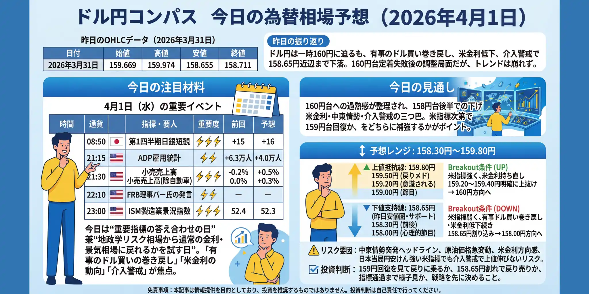 昨日の振り返り(2026年3月31日) 昨日のドル円は、東京早朝に159.80円台でスタートしたあと、朝方には159.97円近辺まで上昇し、160円再トライをうかがう場面がありました。ただ、その後は月末・期末フローが交錯するなかで上値を伸ばし切れず、徐々に失速。日本政府・日銀による為替介入への警戒感が引き続き強く意識されたことに加え、米長期金利の低下が重しとなり、東京午後には159円台半ばへと押し戻されました。 海外時間に入ると、ドル円の下押し圧力はさらに強まりました。背景として大きかったの ...