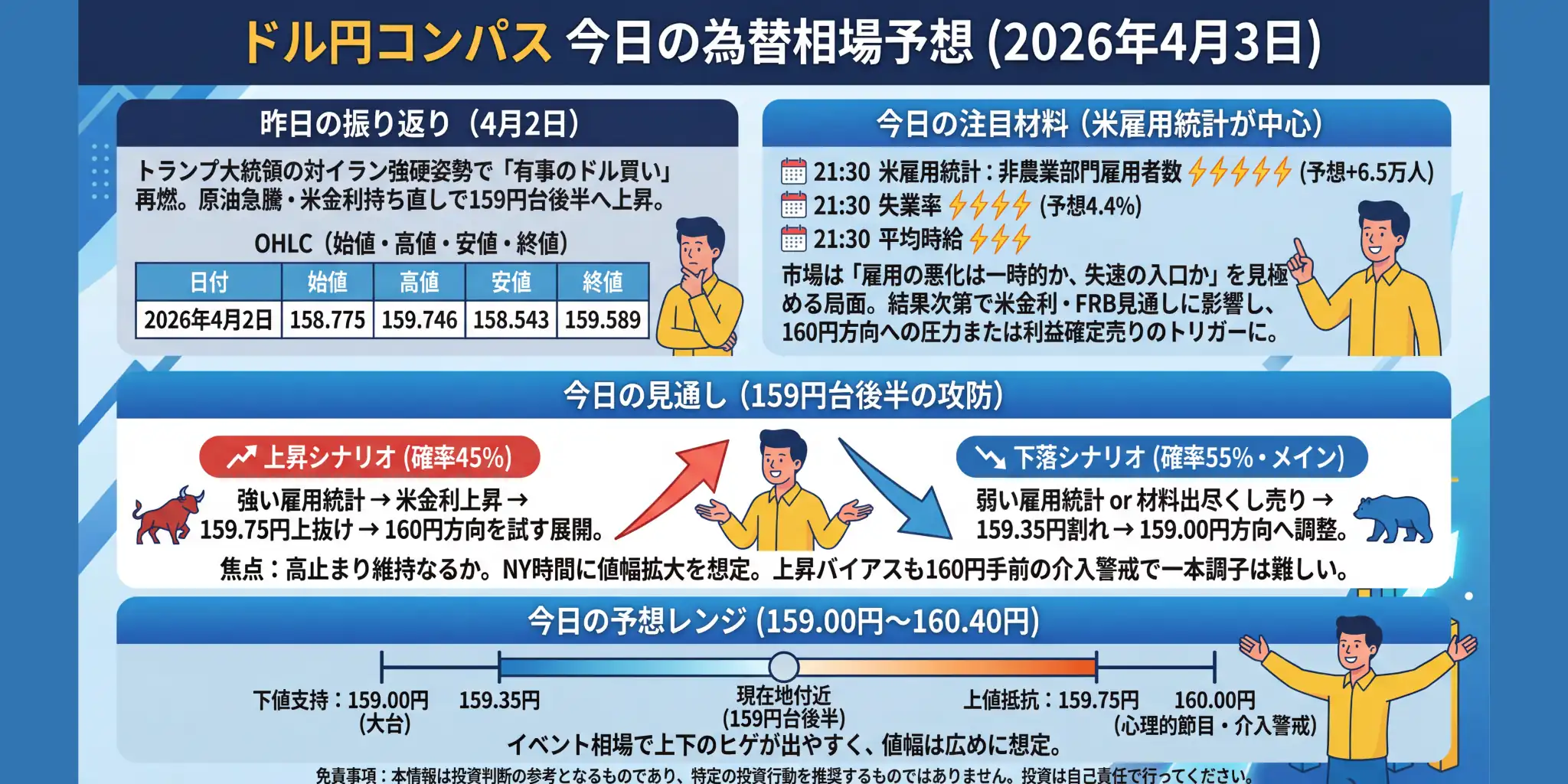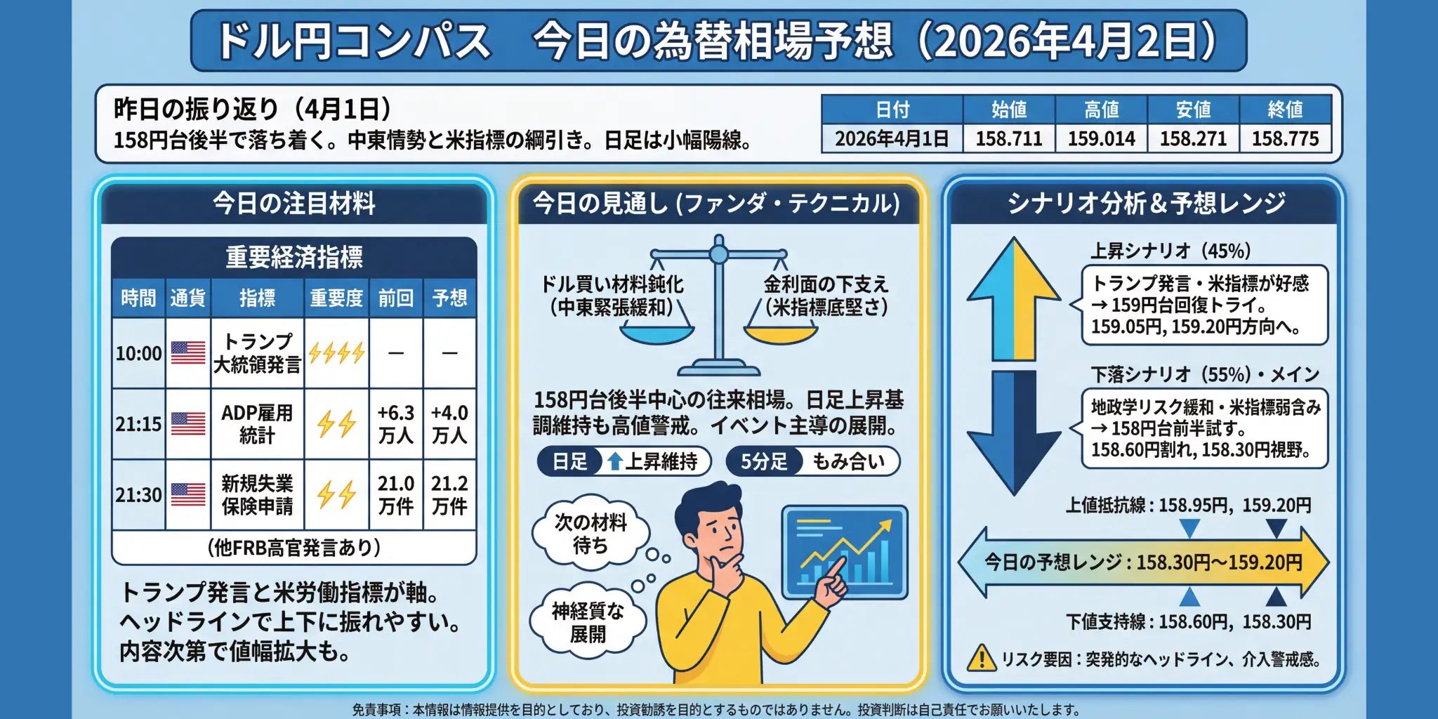 ドル円:昨日の振り返り(2026年4月2日) 4月2日のドル円は、始値158.775円、高値159.746円、安値158.543円、終値159.589円で取引を終えました。日足は安値・高値ともに前日比で切り上がる陽線となり、前日に入っていた調整をほぼ打ち消すような戻りを見せています。値幅は1円超と大きく、テーマ主導で相場が一段上に走った1日でした。 背景として大きかったのは、中東情勢をめぐる見方の再悪化です。トランプ大統領の演説で早期停戦期待が後退し、原油相場が急伸。エネルギー価格上昇を通じたインフレ再燃 ...