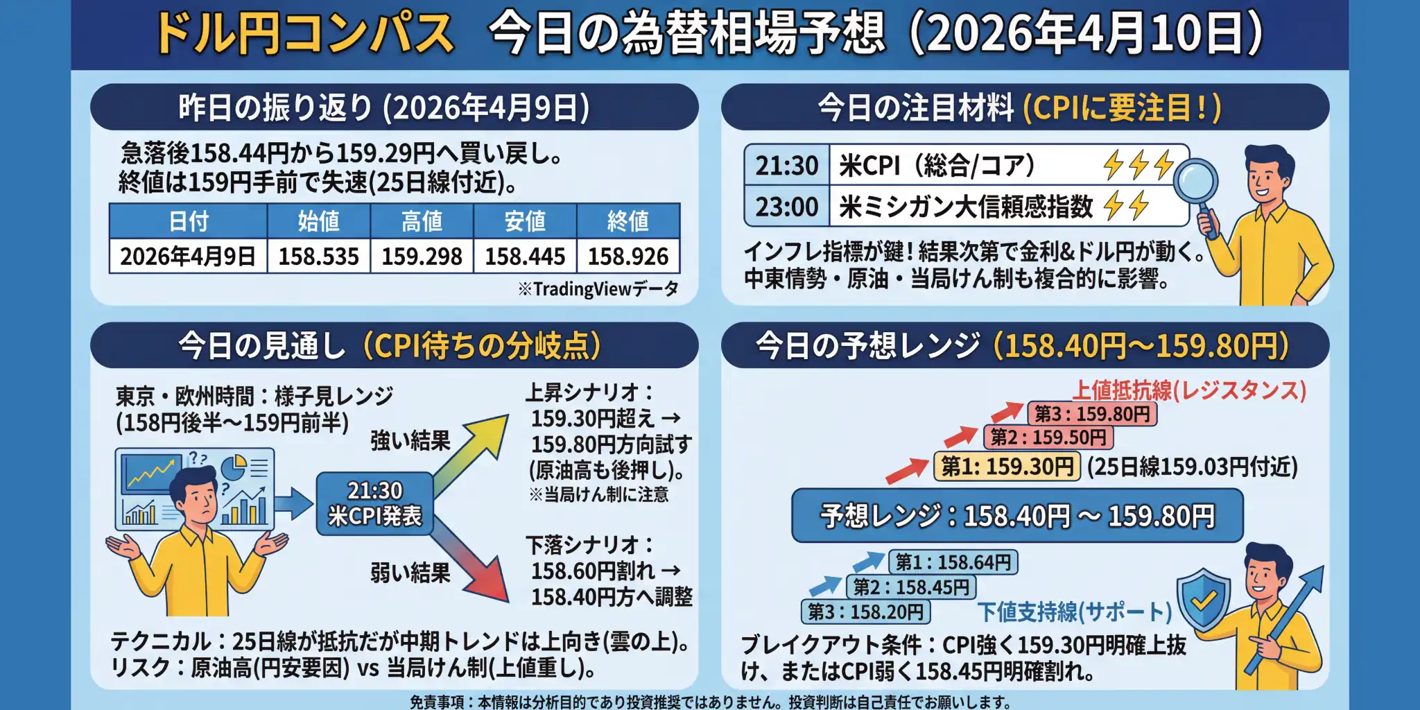 ドル円:昨日の振り返り(2026年4月9日) 4月9日のドル円は、前日の急落に対する自律反発が優勢となり、日足は始値158.535円から終値158.926円まで切り返す陽線で引けました。安値158.445円からの戻りはしっかりしていましたが、高値159.298円まで上昇したあとは上値追いが続かず、終値は159円台乗せに届いていません。全体としては、「急落後の買い戻しは入ったが、25日線付近ではまだ慎重」という一日でした。 日付 始値 高値 安値 終値 2026年4月9日 158.535 159.298 1 ...