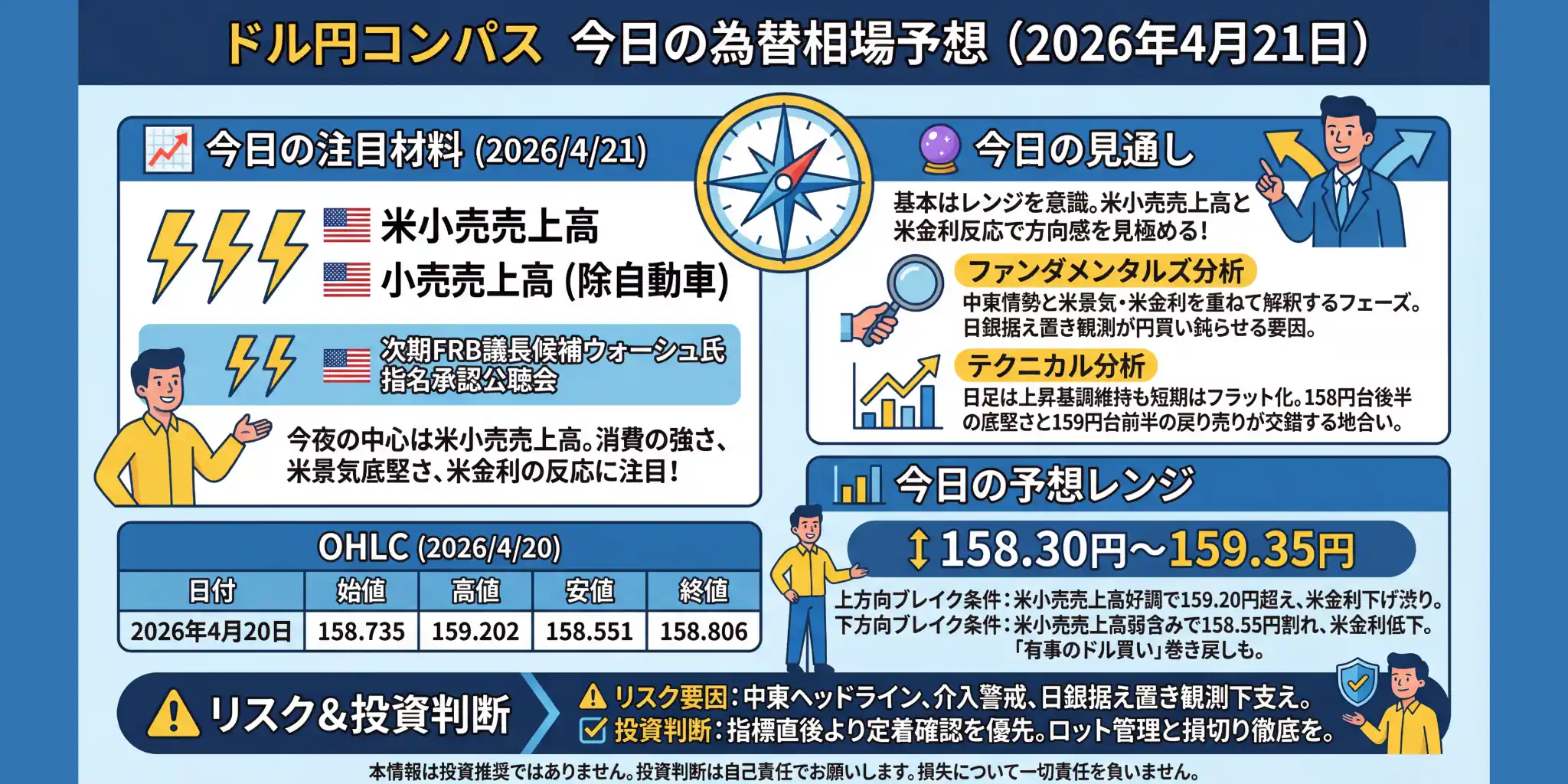 先週末の振り返り(2026年4月17日) 先週末のドル円は、東京時間には159円台半ばまでじり高となったものの、海外時間に入ると流れが一変しました。中東情勢を巡って「有事のドル買い」を支えていた材料がいったん後退し、米長期金利も低下したことで、NY時間にはドル売り・円買いが優勢になりました。日足ベースでは159円台前半で始まり、安値は157.588円まで拡大。値幅の大きい神経質な一日でした。 もっとも、終値は158.587円まで戻しており、ローソク足は陰線ではあるものの下ヒゲもある形です。つまり、159円 ...