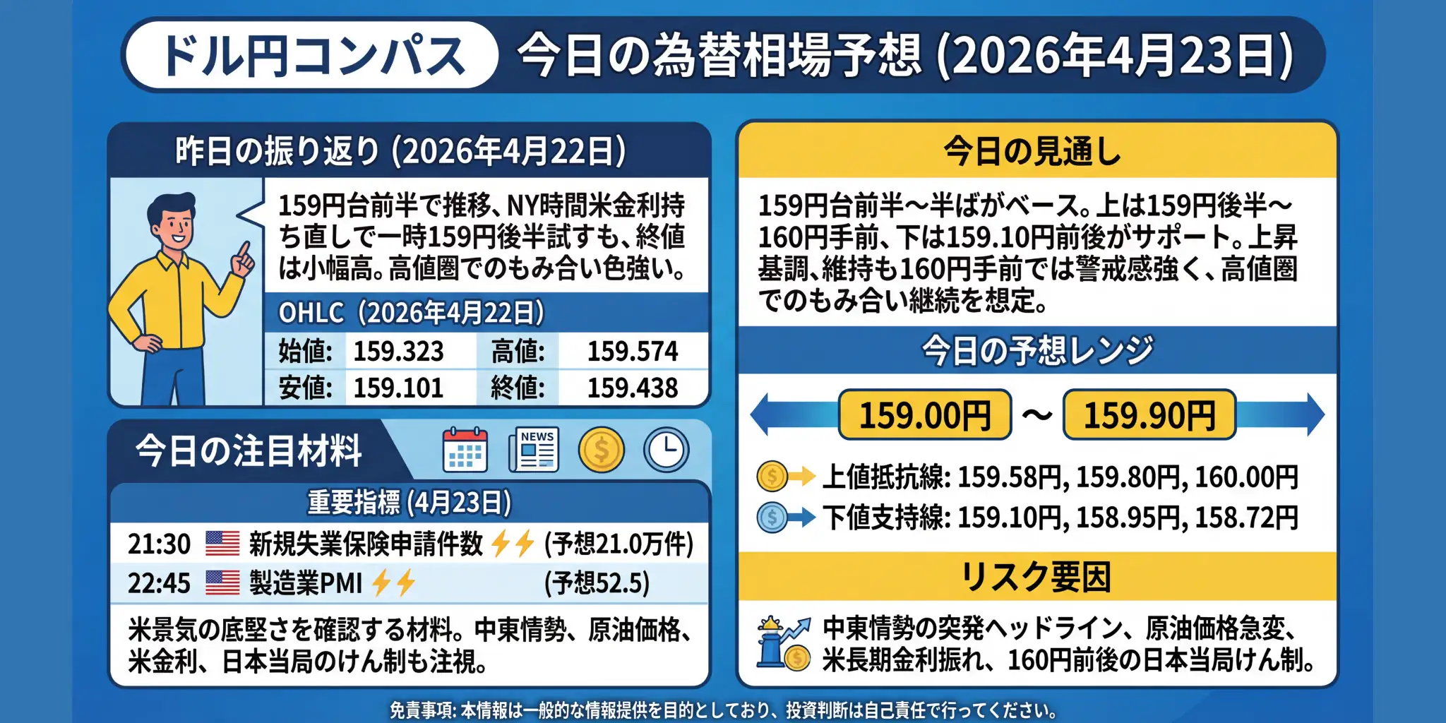 ドル円:昨日の振り返り(2026年4月21日) 4月21日のドル円は、東京時間では158円台後半を中心とした落ち着いた推移でしたが、欧州時間以降は円売り・ドル買いが優勢となり、1日を通してみるとじり高基調が続きました。材料としては、まず日銀が次回会合で追加利上げを見送るとの観測が円の重しとなり、そのうえで米3月小売売上高が市場予想を上回ったことで、米金利の先高観がドルを支える構図になりました。 一方で、値動きは一本調子ではありませんでした。中東情勢を巡る不透明感から「有事のドル買い」が入りやすい地合いが続 ...