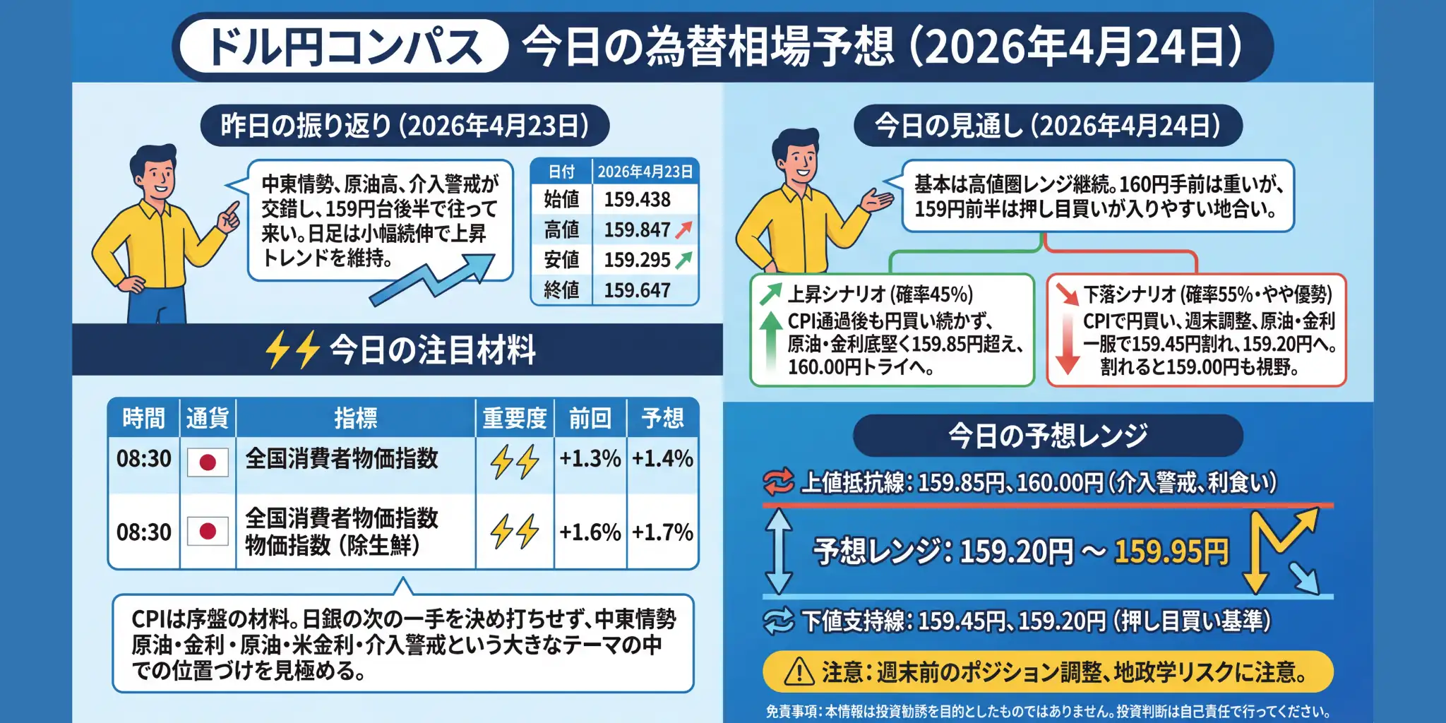 昨日の振り返り(2026年4月22日) 4月22日のドル円は、始値159.323円に対して終値159.438円と小幅高で引け、日足では短い実体の陽線となりました。値幅自体は47銭程度にとどまり、前日と比べると高値はやや切り下がった一方で、安値は切り上がる形です。方向感が一気に出たというより、159円台前半から半ばで上昇トレンドの勢いをいったん確かめるような一日だったと言えそうです。 地合いとしては、中東情勢をめぐる不透明感がなおドルを支える一方、停戦延長の報道で過度なリスク回避がやや和らぐ場面もあり、東京 ...