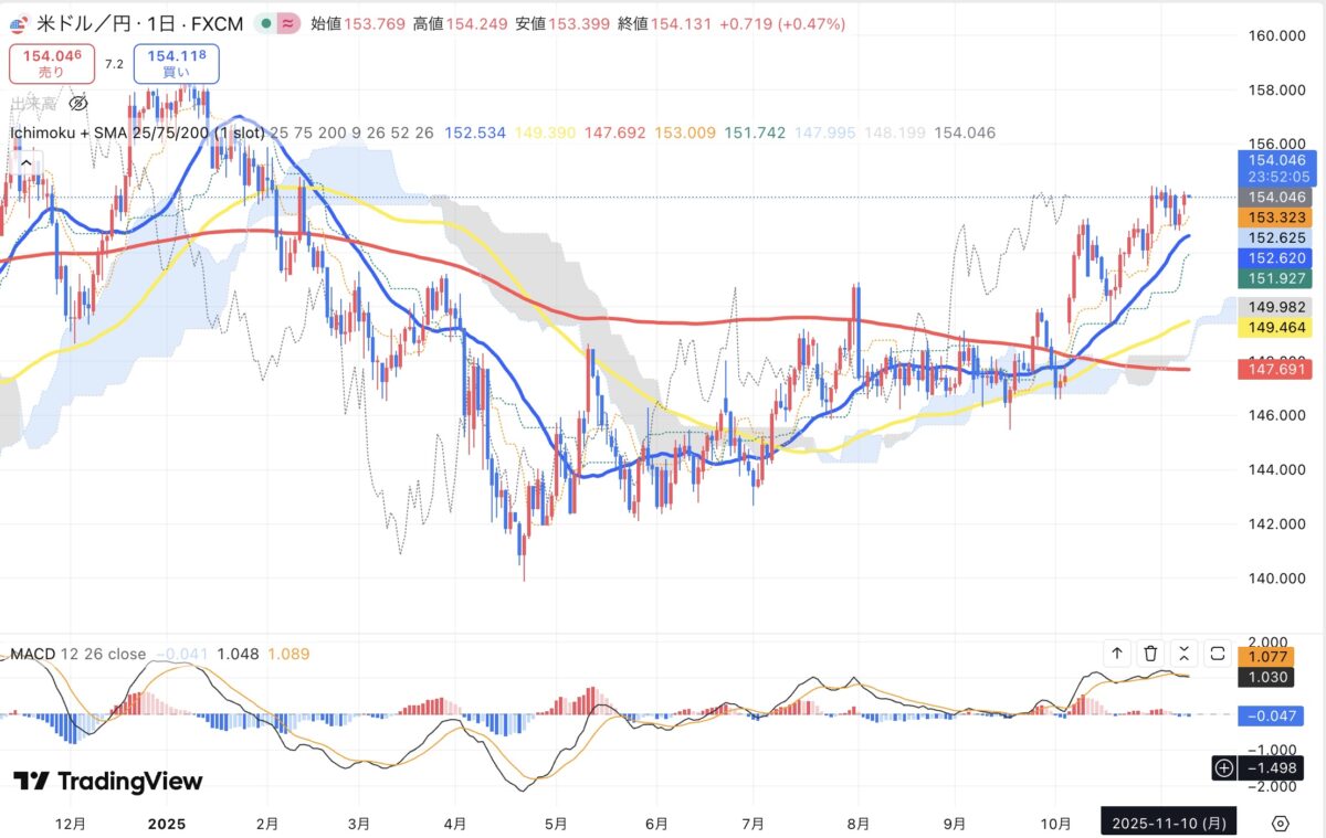 昨営業日である11月10日(月)のドル円相場は、米国の政治リスク後退を好感したリスクオンの流れに乗り、終日堅調な展開となりました。東京時間から円売りの流れが強まると、欧州、ニューヨーク時間にかけてその動きは加速し、一時154.249円まで上値を伸ばしました。最終的に154.131円で取引を終え、高値圏を維持したまま週明けの取引をスタートさせています。