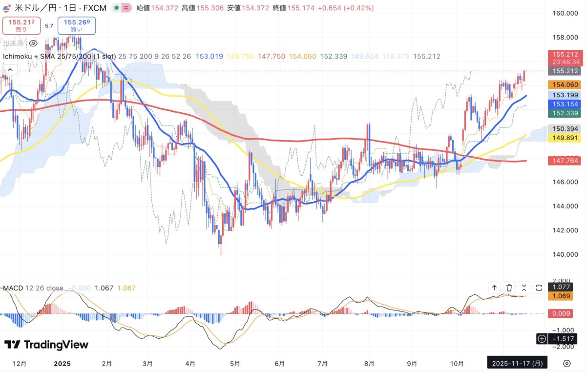 155.50円は心理的な節目として意識され、短期的な目標となりやすい水準です。このレベルを明確に上抜けると、政府・日銀による為替介入への警戒感が一段と強まる156.00円が次のターゲットとして視野に入ってきます。
