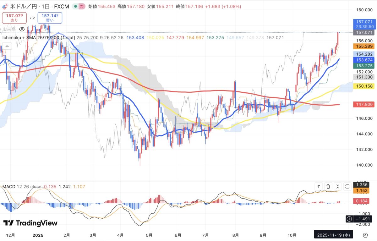 昨日157円台に乗せたことで、ドル円の上昇トレンドはさらに勢いを増しています。各種テクニカル指標も総じて強気を示唆していますが、短期的な過熱感も意識され始める水準であり、指標発表をきっかけとした調整下落には警戒が必要です。