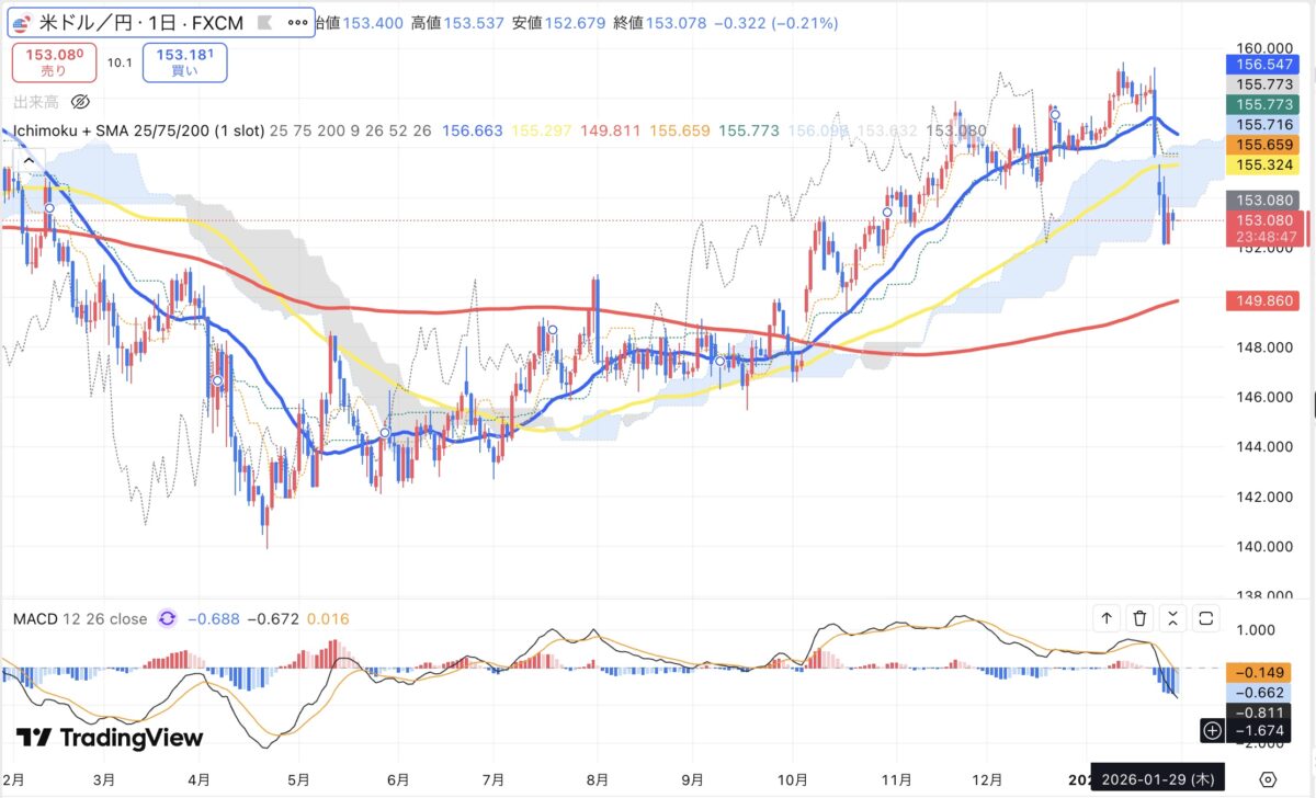 25日移動平均線は依然として右肩上がりを維持しているものの、足もとのレートはこの25日線を明確に下回る位置まで急落しており、短期的には「行き過ぎた円安の巻き戻し」が進んだ形です。75日線は155円台前半で緩やかな上向きを保ち、200日線も149円台後半で底堅い動きを続けているため、中長期的な上昇トレンド自体はまだ完全には崩れていませんが、直近では25日線が上値抵抗として意識されやすくなってきました。