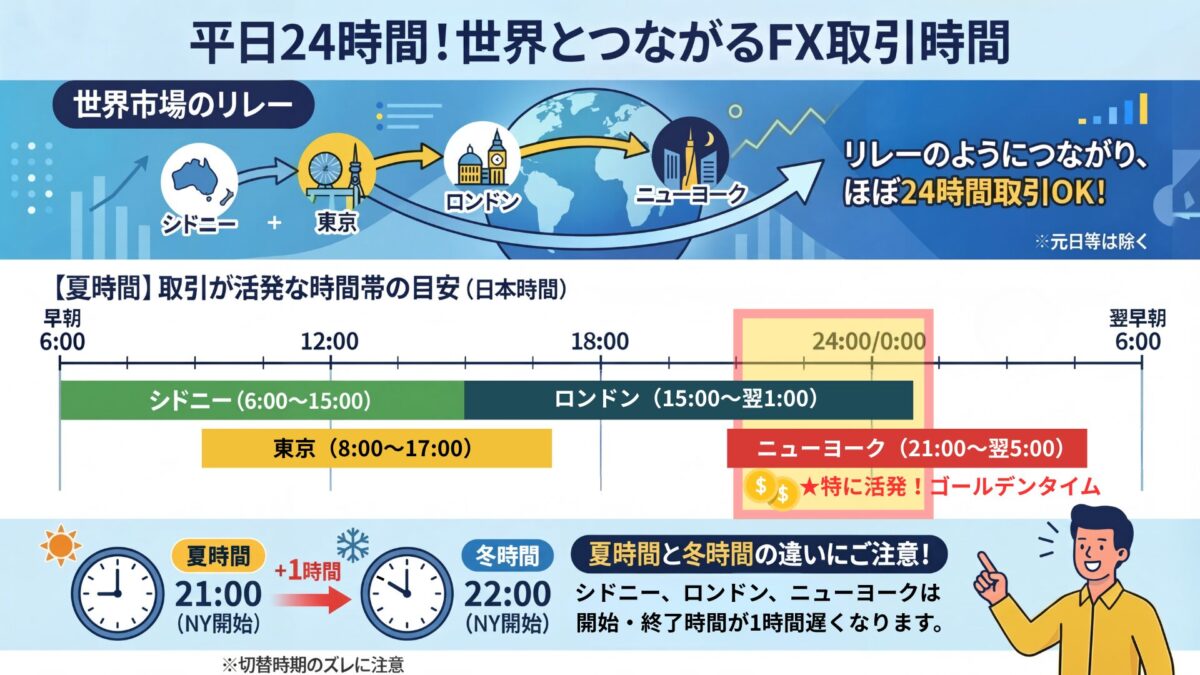 取引が活発になりやすい時間帯(日本時間の目安)は、たとえば「夏時間(サマータイム)」だと次のイメージです。