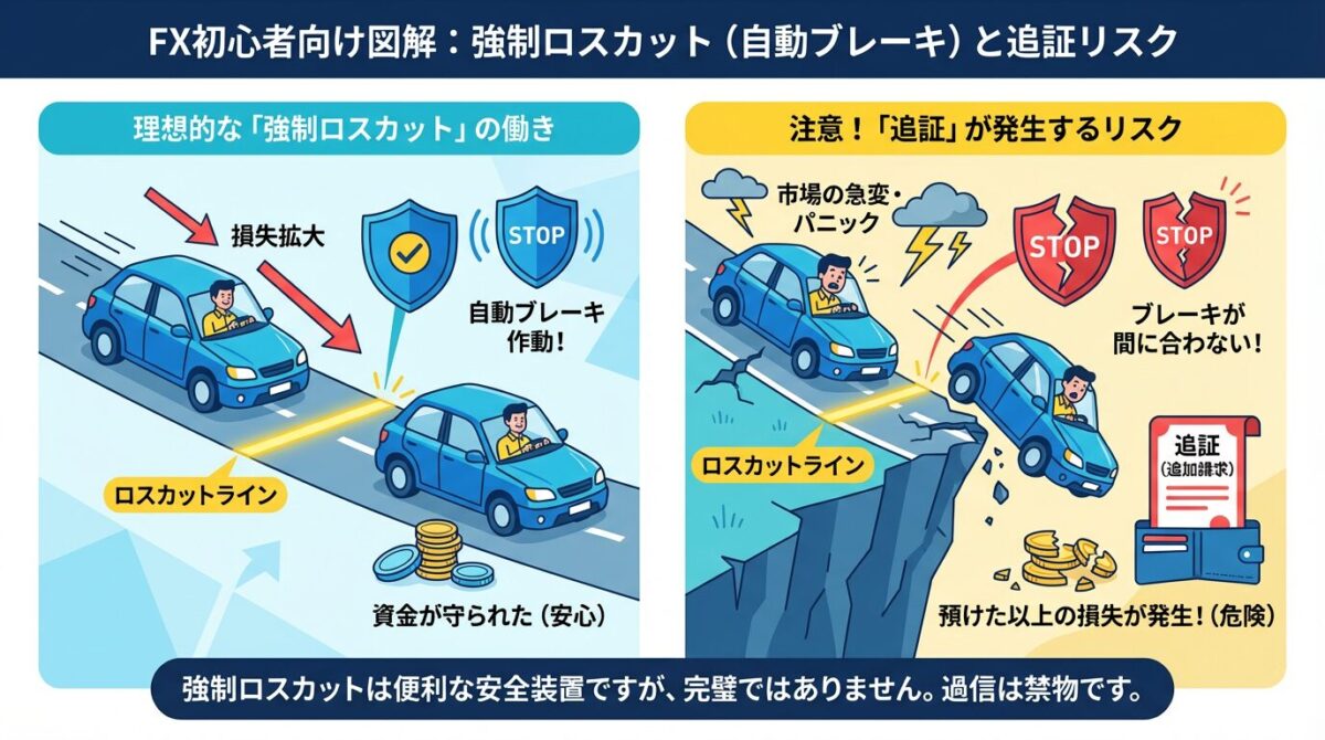 そんな時、あなたの資金がすべて無くなってしまうのを防ぐため、FXには「強制ロスカット」という、一種の「自動ブレーキ」のような仕組みが備わっています。