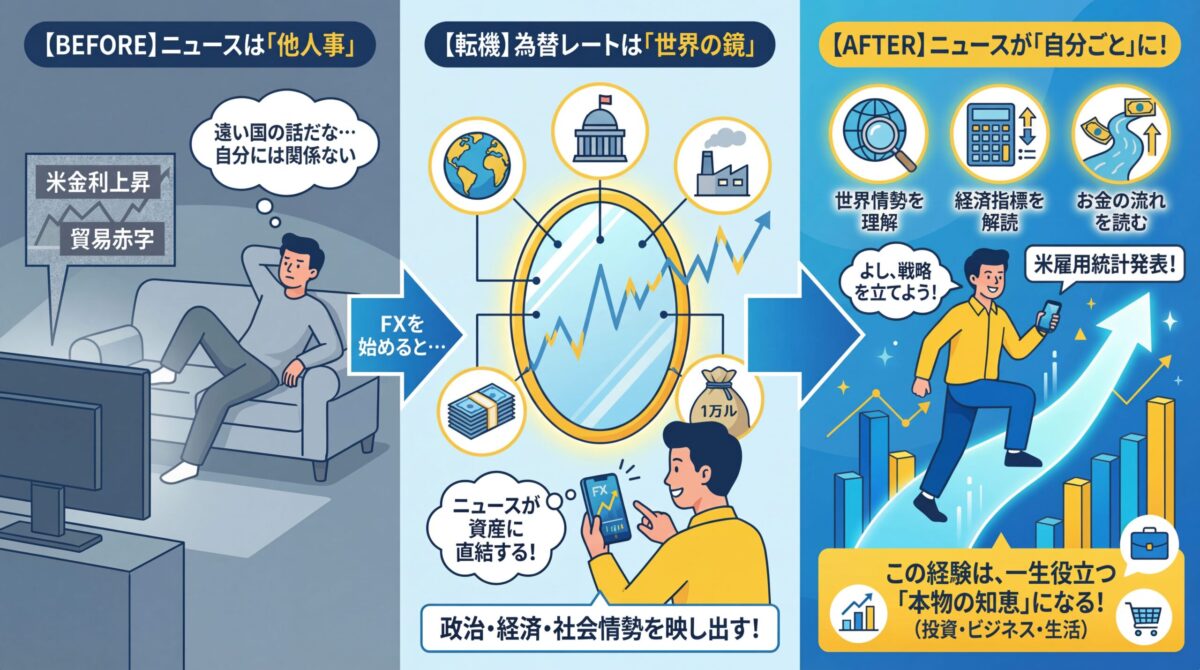 「アメリカの金利が上がった」「日本の貿易収支が赤字だった」といったニュースの一つひとつが、あなたの資産に直接影響を与える「自分ごと」として、リアルに感じられるようになるのです。