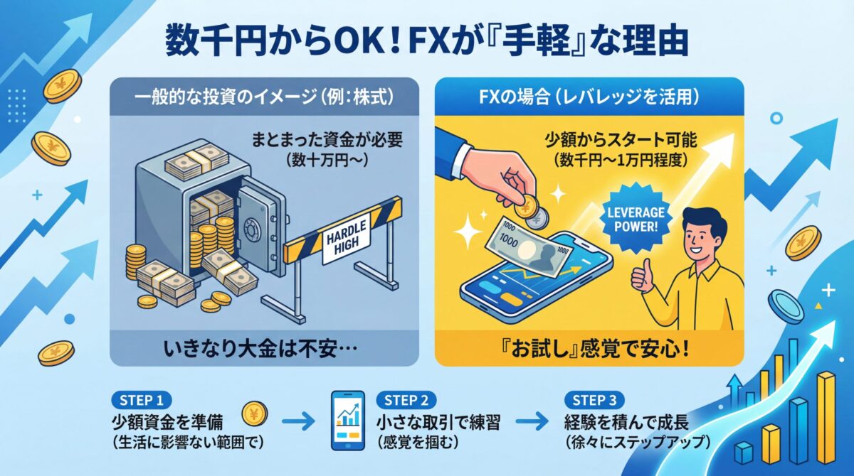 前の章で学んだ「レバレッジ」の仕組みがあるおかげで、FXは数千円〜1万円程度の、非常に少ない金額からでも実際に取引を始めることが可能です。