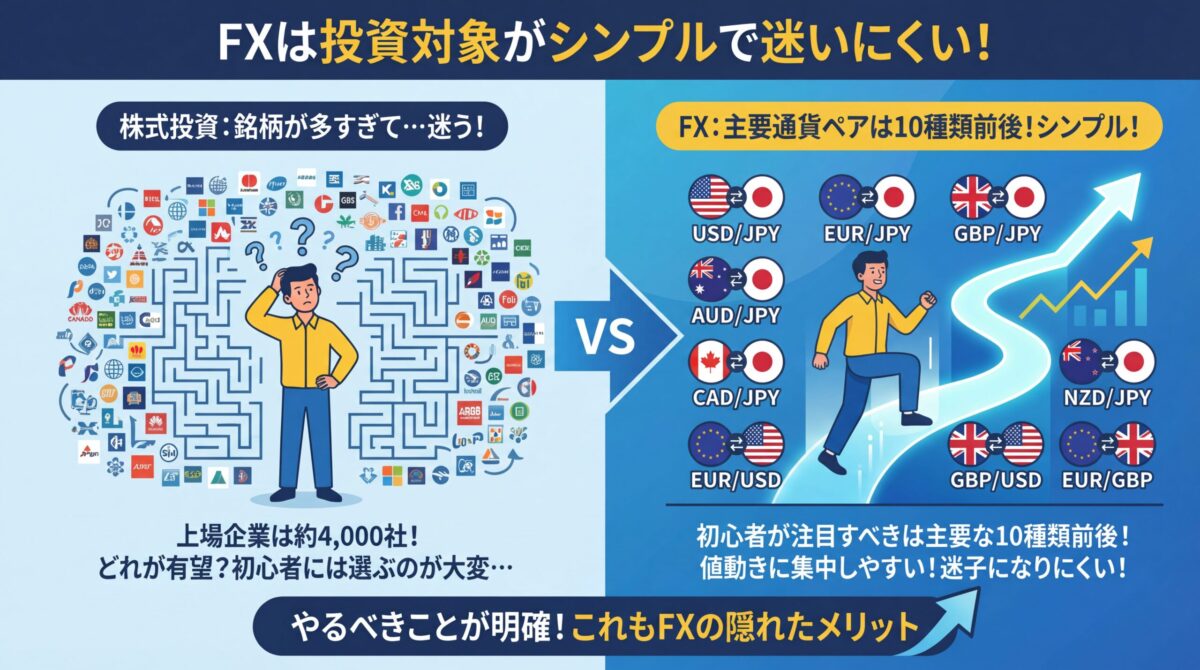 数千社の中から投資先を選ぶ株式投資と比べ、FXではまずこの10種類程度の通貨の値動きに集中すれば良いため、やるべきことが明確で、迷子になりにくいのです。
