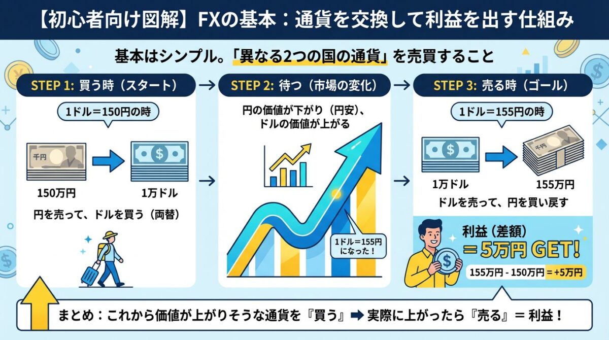 基本はシンプル。「異なる2つの国の通貨」を交換すること